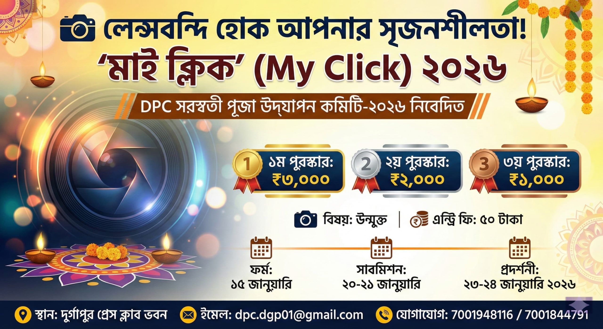 Newz Desk, Durgapur : Ahead of the upcoming Saraswati Puja, the DPC Saraswati Puja Celebration Committee has announced a special photography exhibition and competition titled ‘My Click’. The event will be held at the Durgapur Press Club building on January 23 and 24, 2026, from 4 pm to 7 pm.